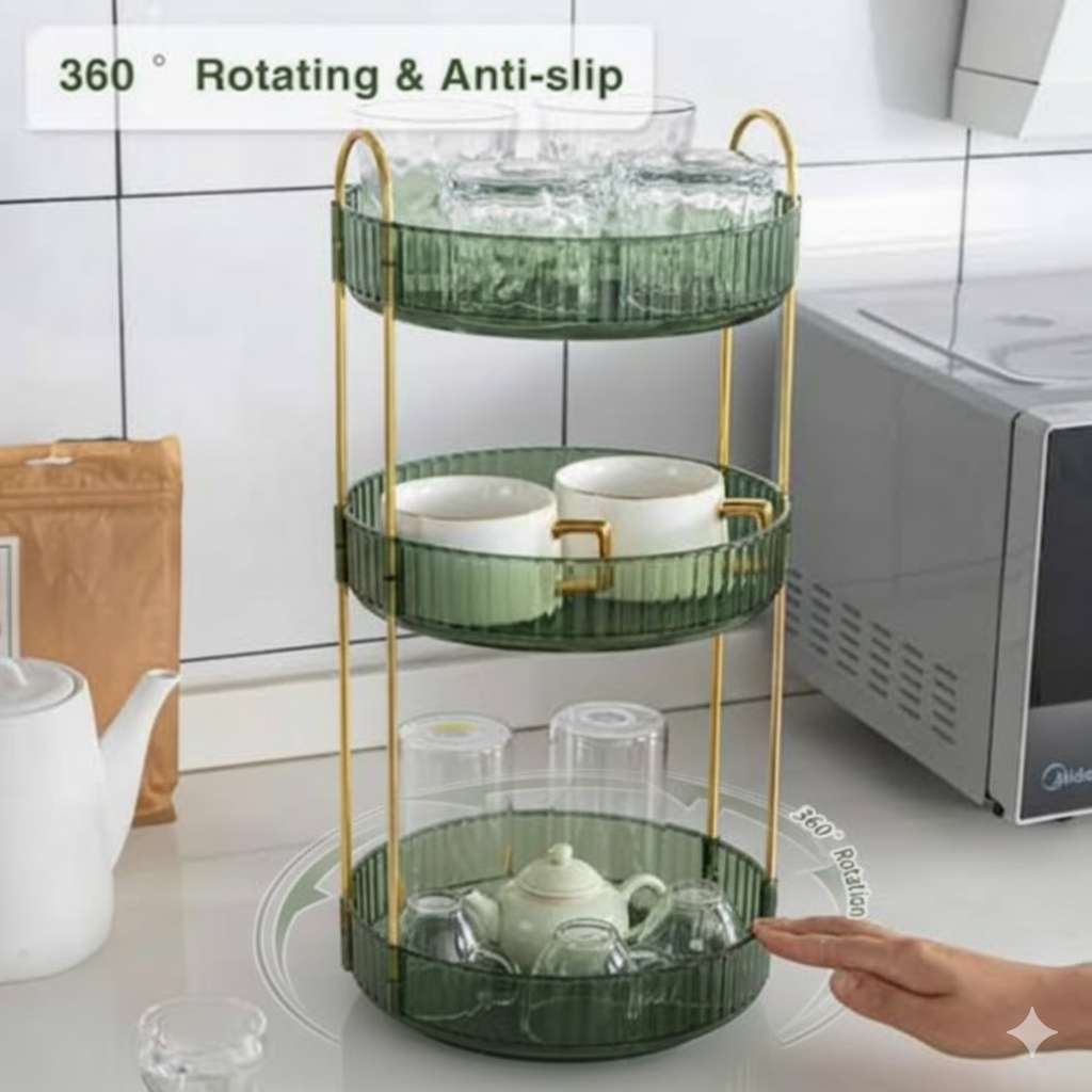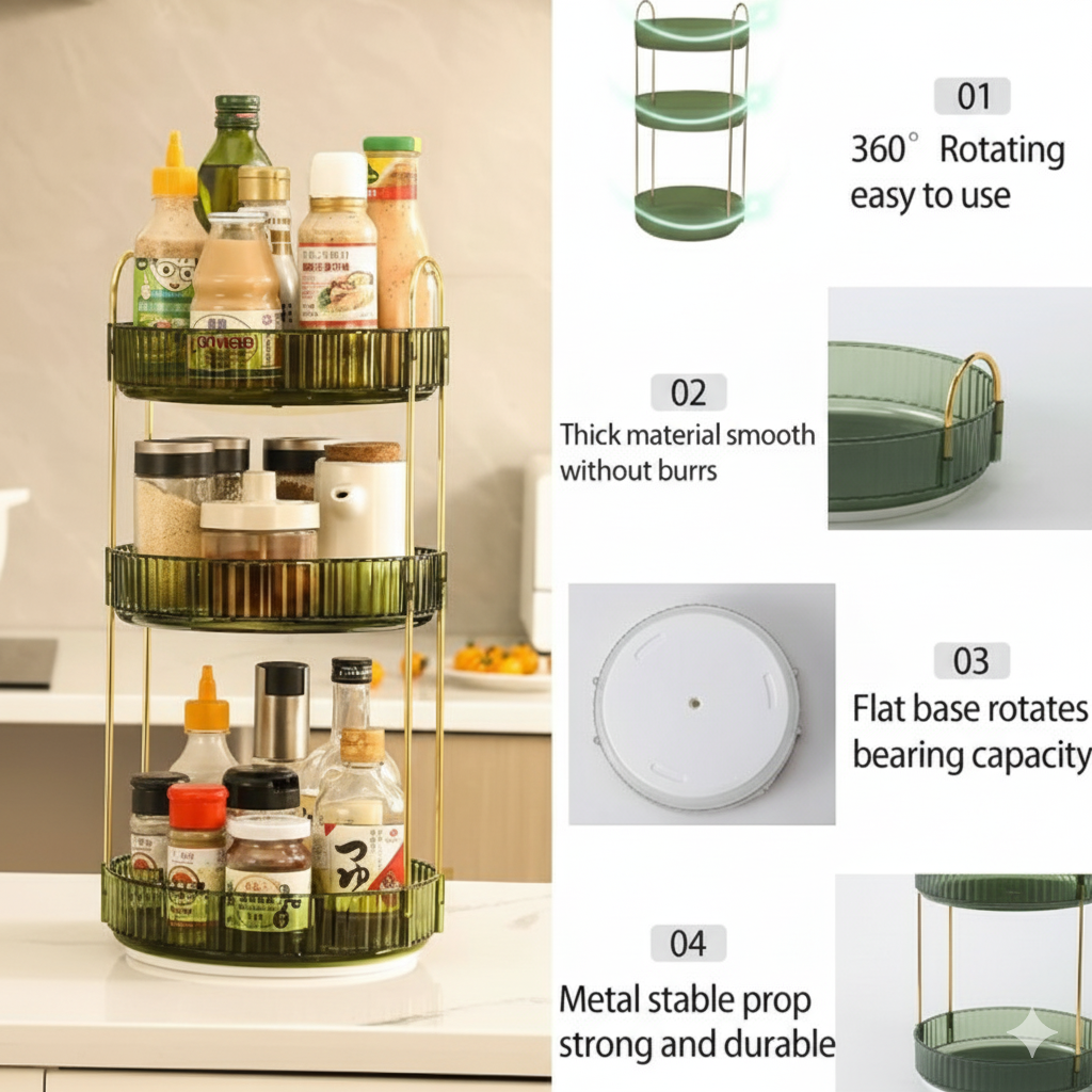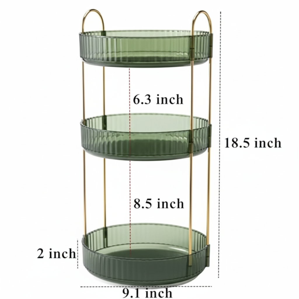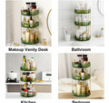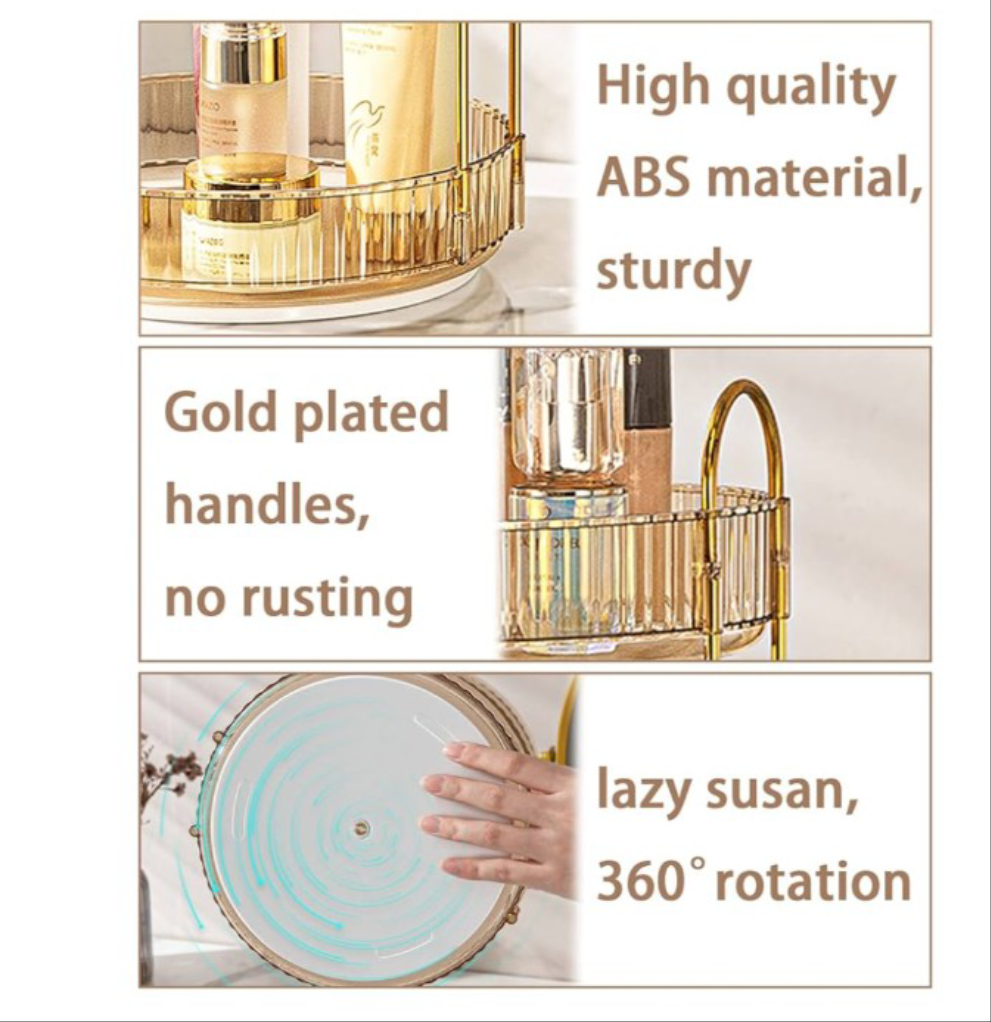 It features multiple tiers and a rotating base for easy access to cosmetics and beauty products.