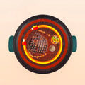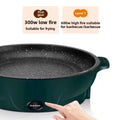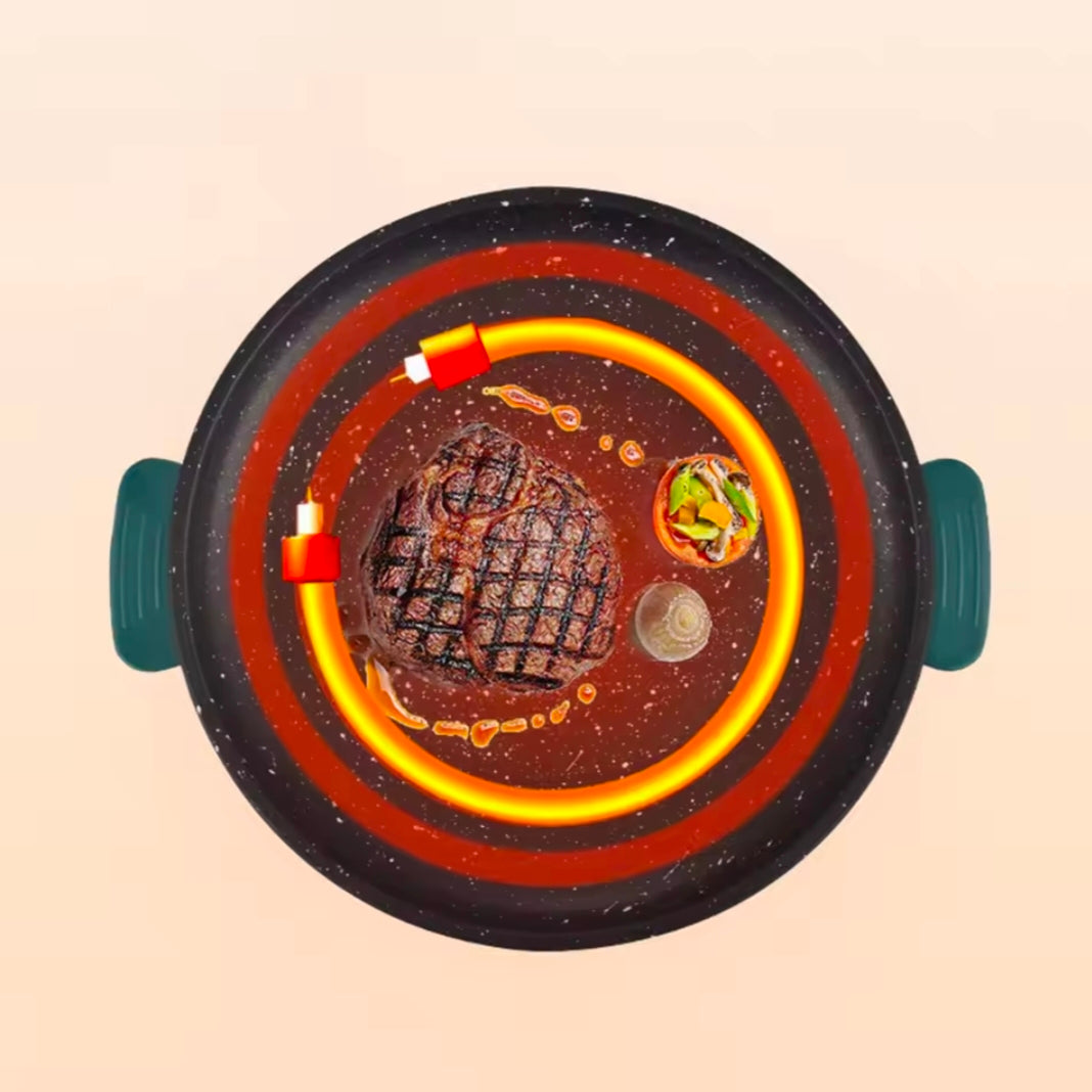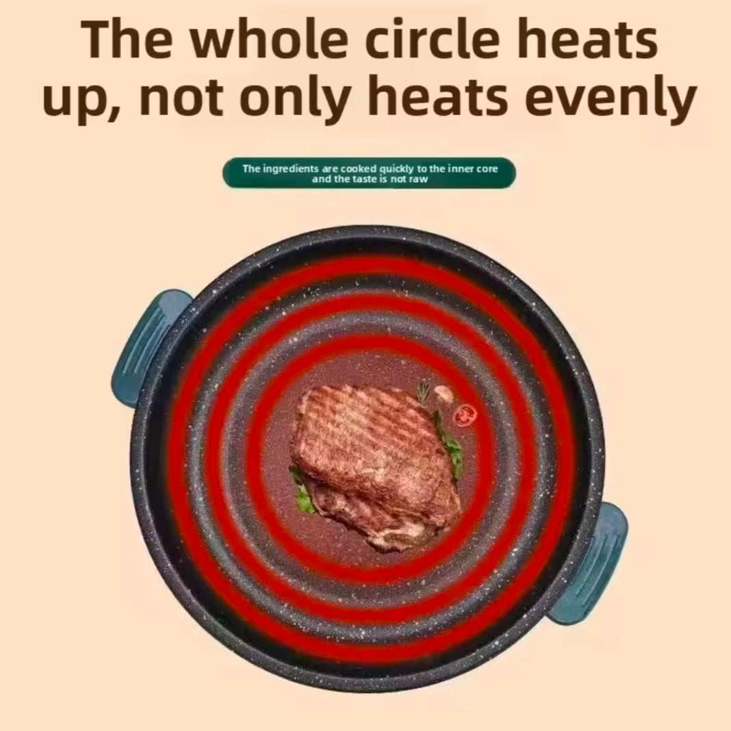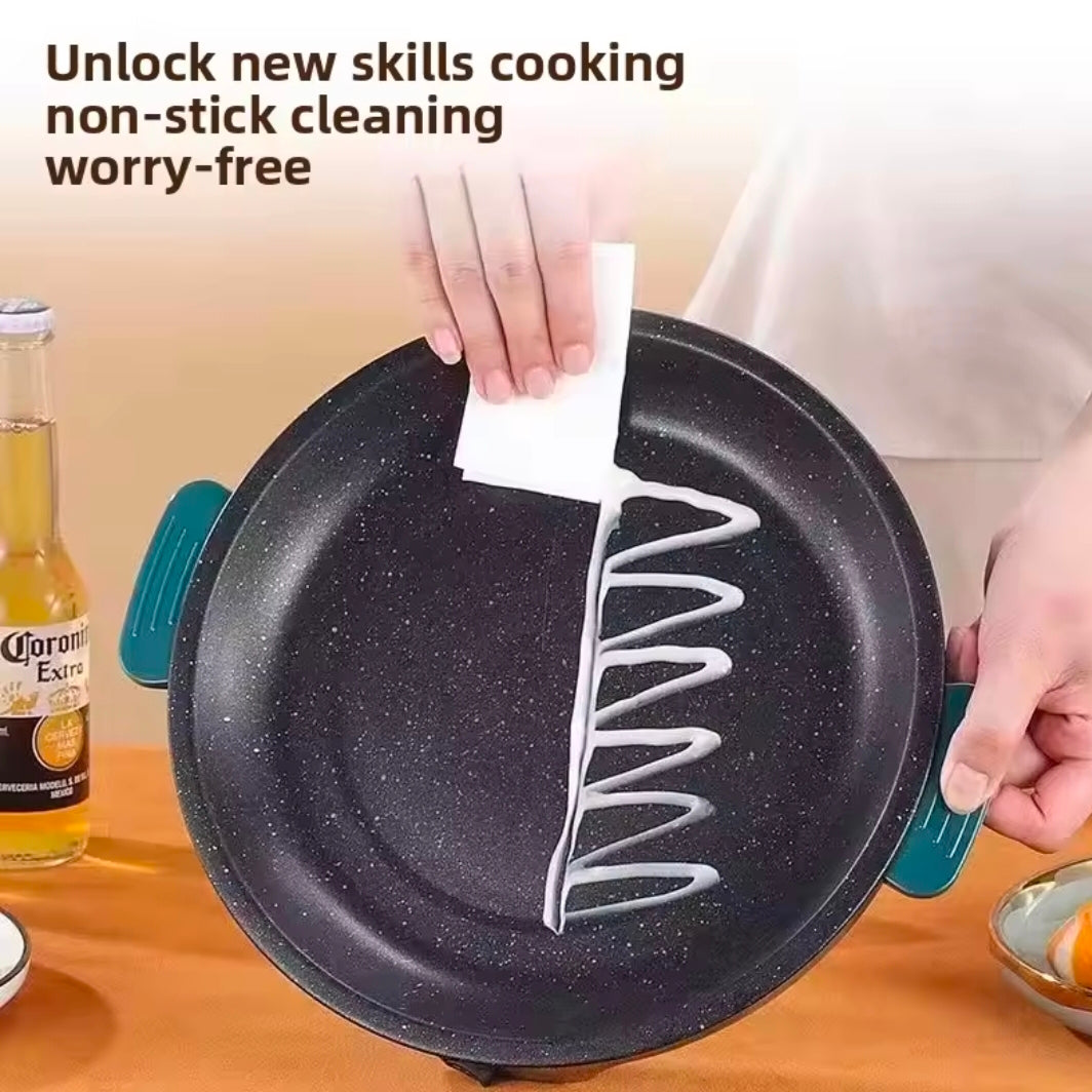 The pan is often equipped with temperature control and safety features like automatic power-off to prevent overheating.