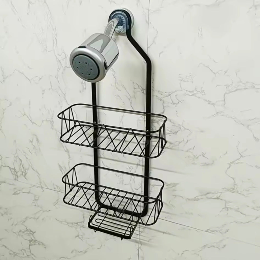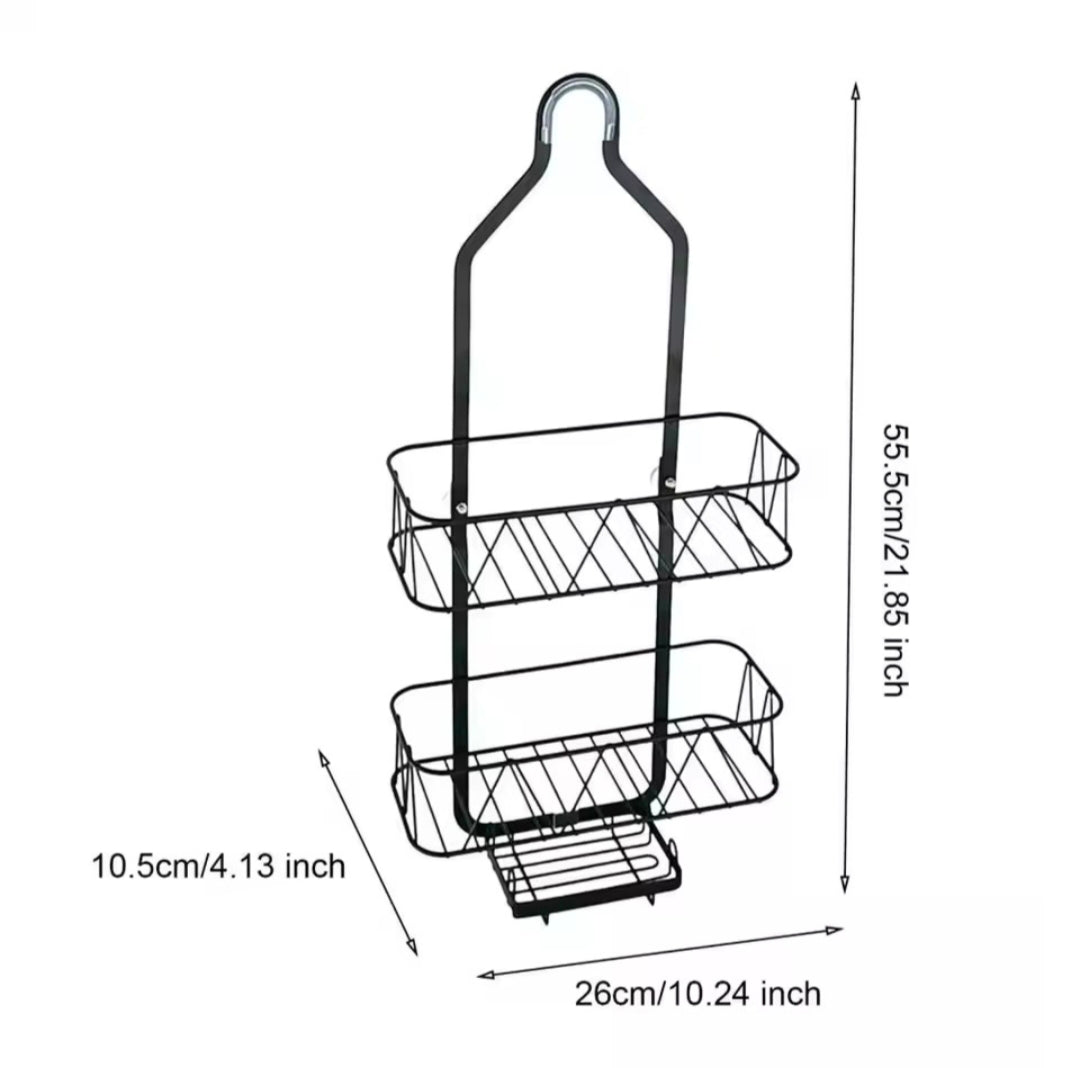 It typically features a two-tier design with an additional small rack at the bottom, likely for a bar of soap or a sponge.