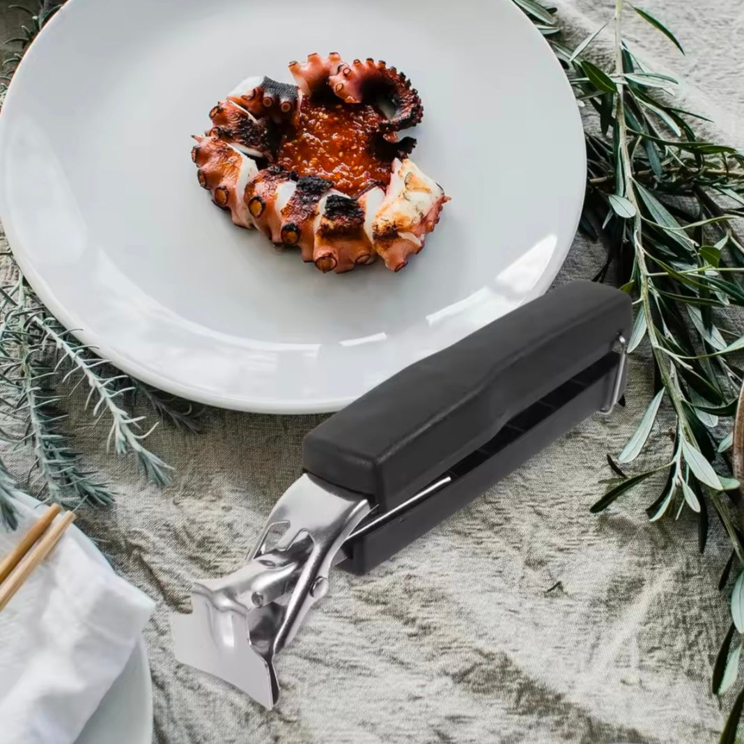 It is typically made of stainless steel with an ABS plastic handle and silicone pads for a secure grip.