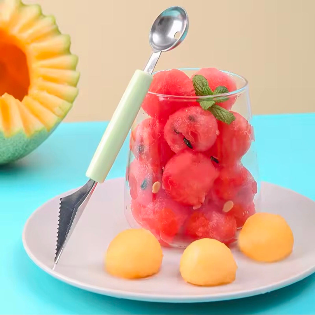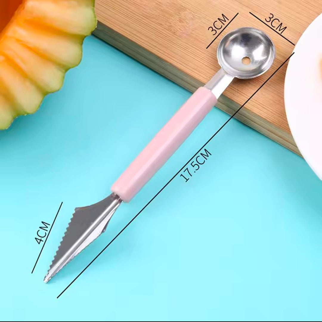 It has two different-sized ends: a scoop for making spherical fruit balls or ice cream, and a serrated carving knife for creating decorative designs.