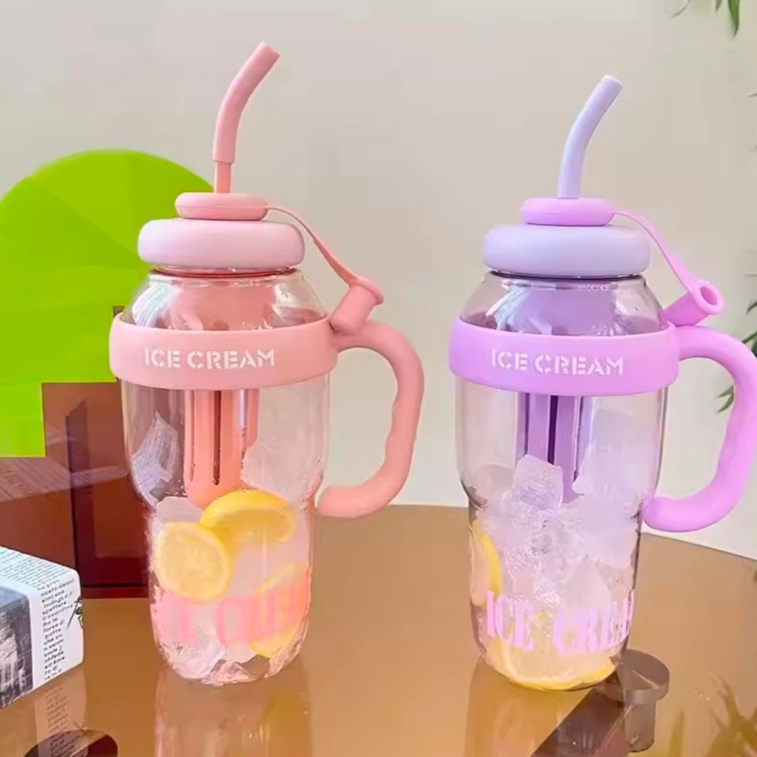 The design includes a handle and a wide mouth opening for easy cleaning and adding ice or fruit.