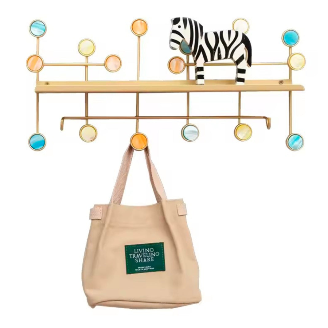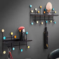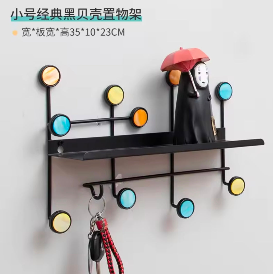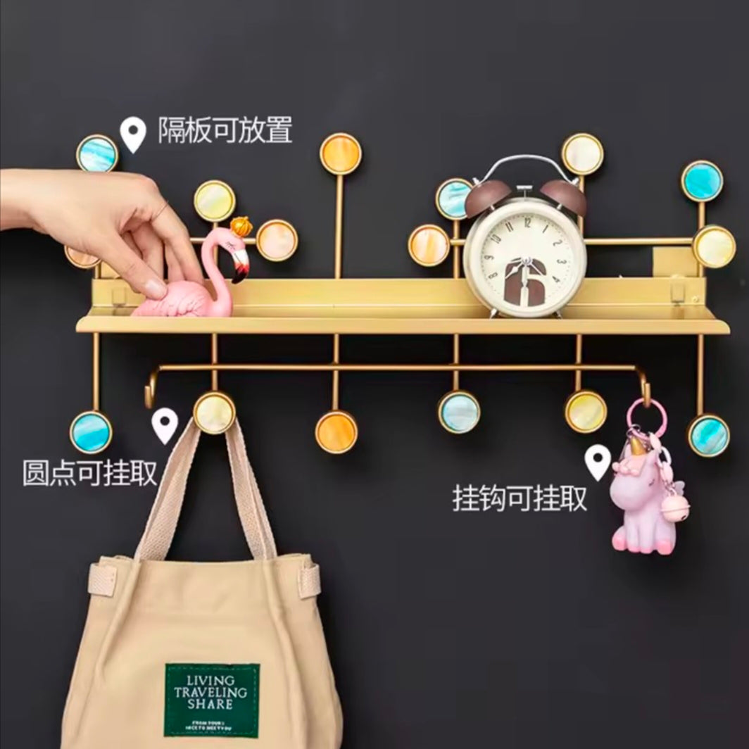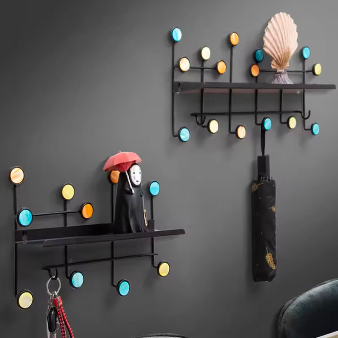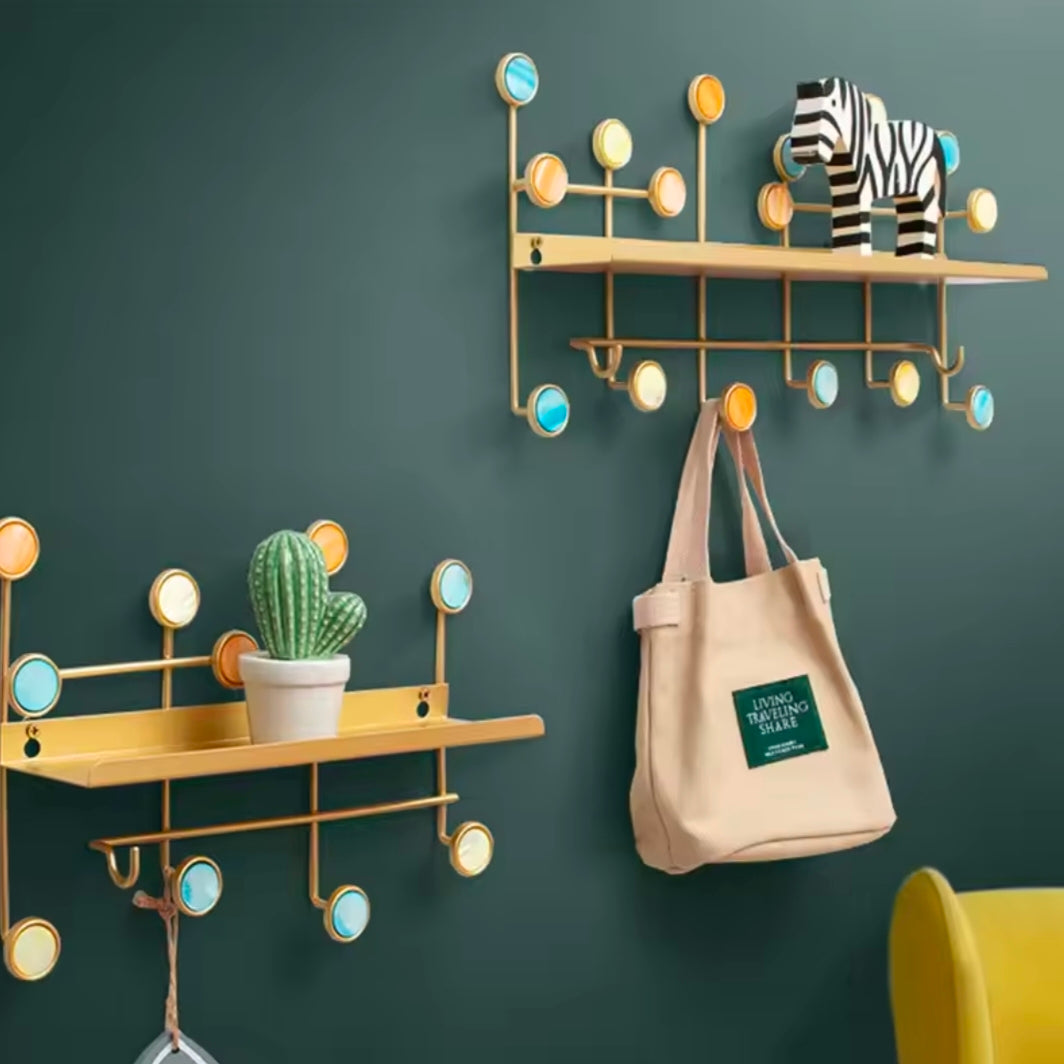 Features: Combines a shelf for placing items with hooks for hanging.