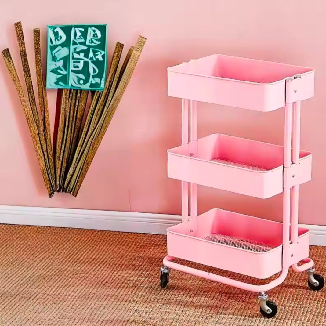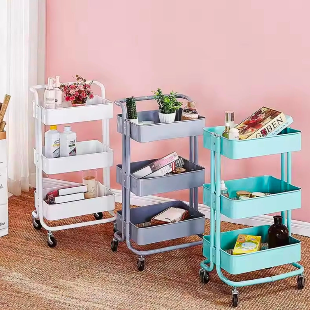 Design: It features three rectangular, solid-bottom shelves and a handle for pushing or pulling.