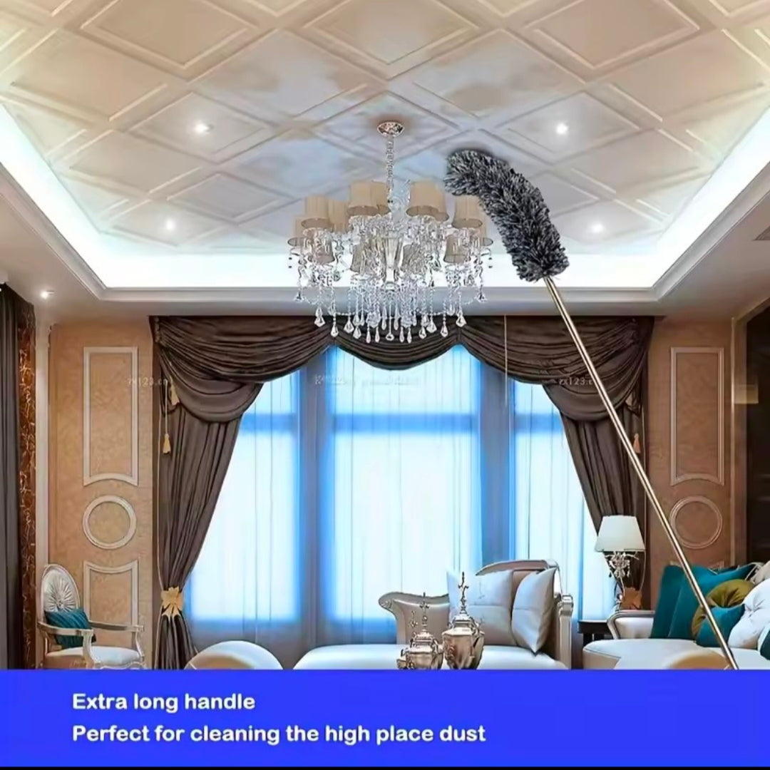 The handle is telescopic and can be extended to clean high ceilings, fans, and walls without the need for a ladder.