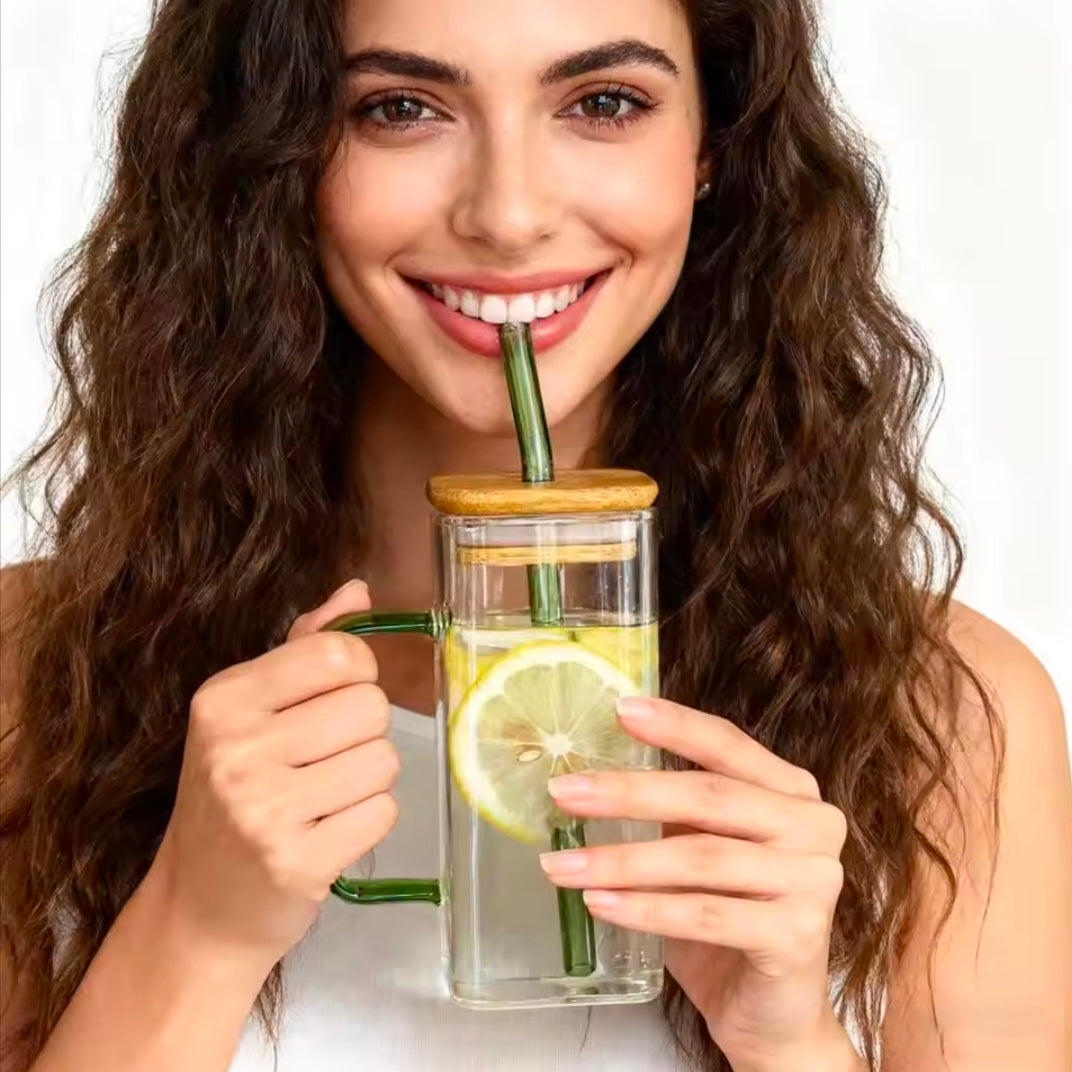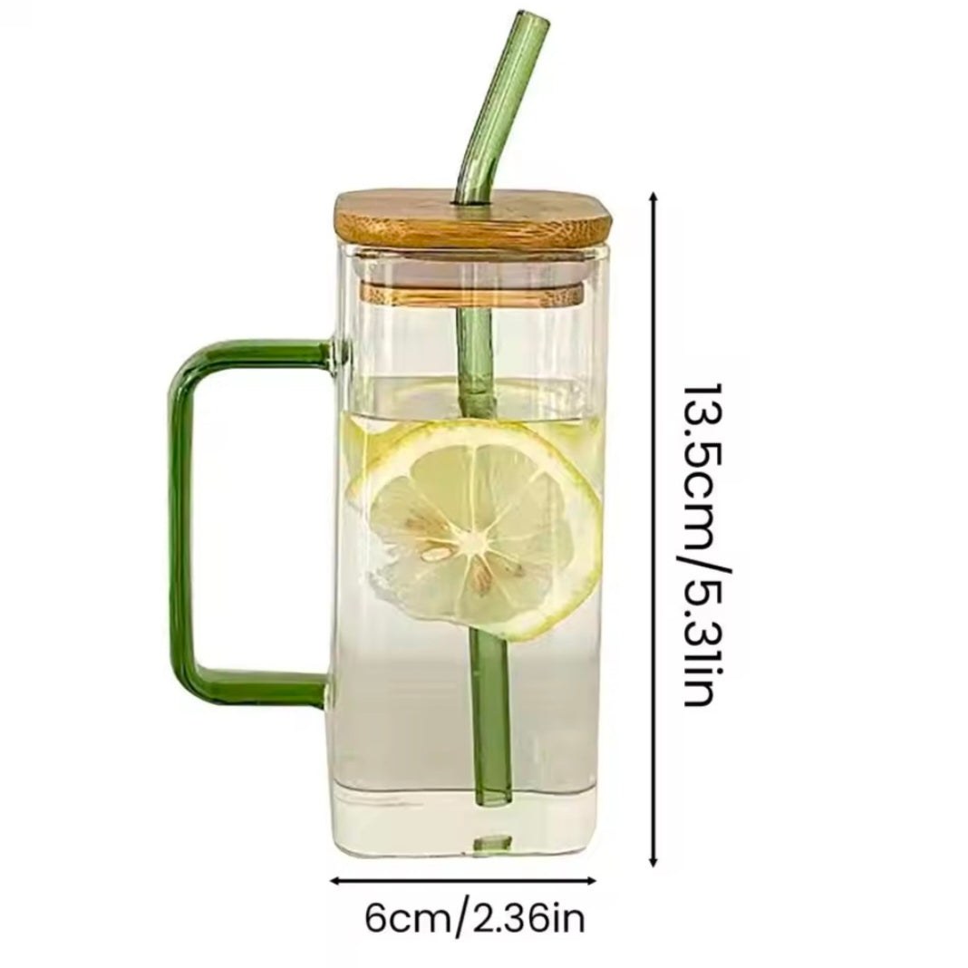 Square Glass Tumbler with Handle and Lid 380ml Transparent Coffee Cup portable Tea Milk Jar for Hot Cold Drinks Travel Water Cup
