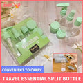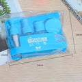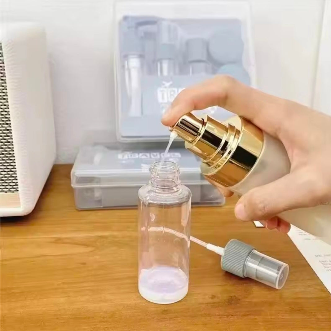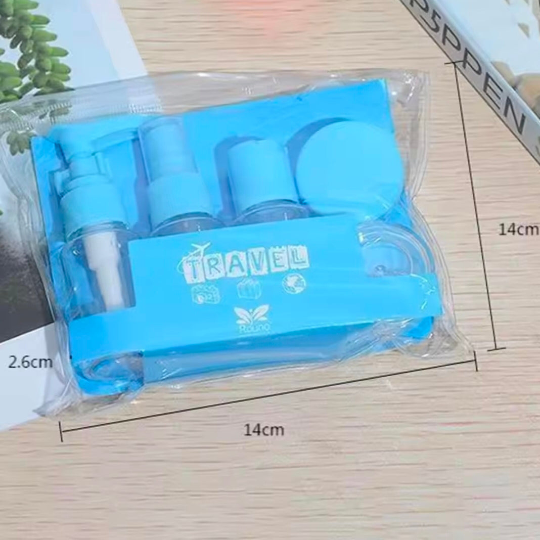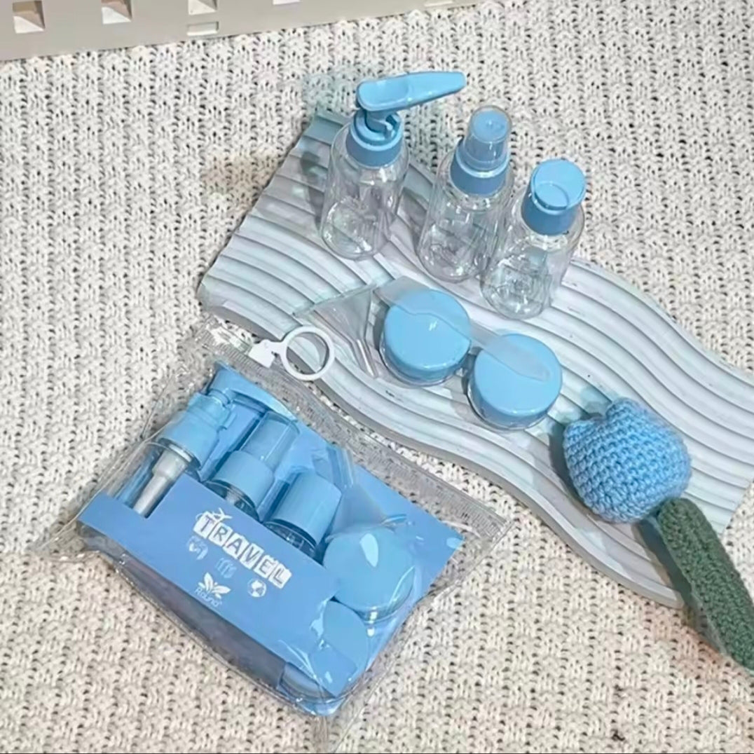 The set includes various bottles with different caps, such as snap caps and screw caps, suitable for liquids like shampoo, conditioner, and lotion.
